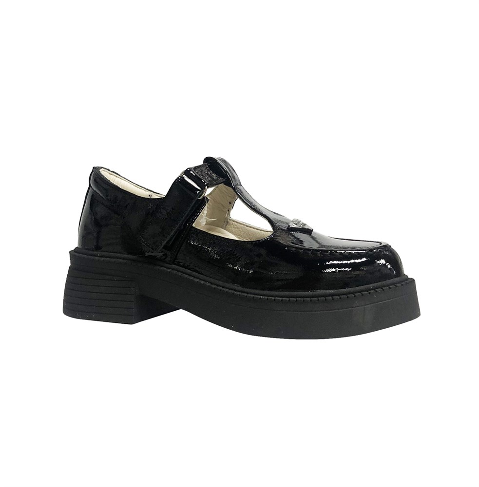 Туфли для девочки, цвет черный (наплак, с эмблемой), ремешок на липучке